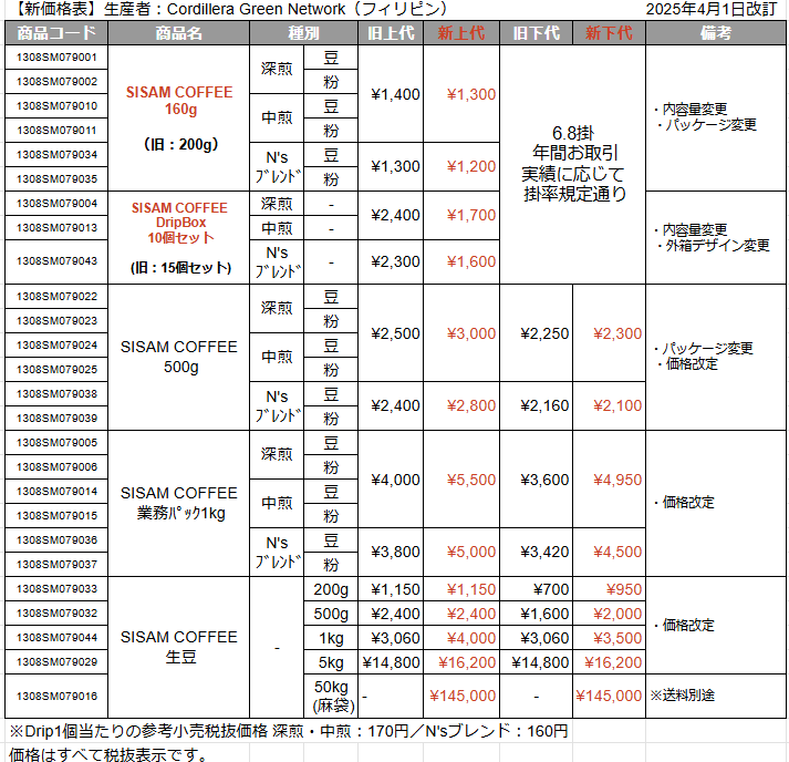 平素は、格別のご高配を賜り、誠に有難うございます。 昨今のコーヒー豆の国際的な価格高騰に加え、生産地における人件費や資材費の上昇により、従来の価格体系を維持することが困難な状況となっております。 これまでも、価格の維持に努めてまいりましたが、 弊社単独での努力では難しい状況となりました。 つきましては、誠に不本意ではございますが、