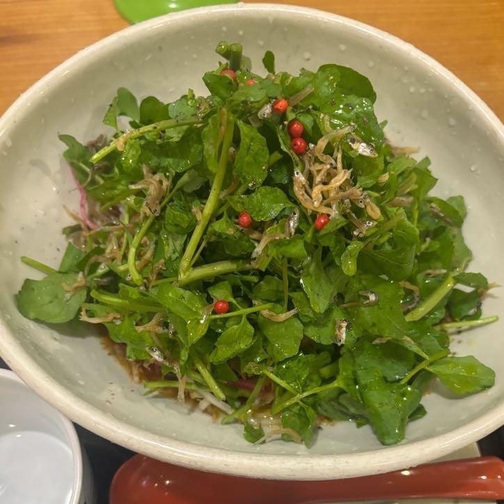 冷たい蕎麦の上に山盛りのクレソン、細切りの大根、カリカリのじゃこ、ピンクペッパー!サラダ感覚のお蕎麦をむしゃむしゃ食べて、パワーが湧きました。クレソン好きにおすすめです。