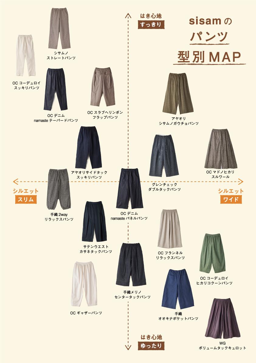 衣替えの時期にぴったりなsisamのパンツ型別MAPを作りました!