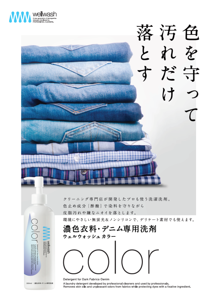 海を守る洗剤にのwellwash(color / カラー)は天然由来の酢酸で色落ち・色移りを防ぎ、デニムや色柄衣類の鮮やかさを守ります。大切なお洋服を長く、きれいな色合いのまま楽しみたい方にぴったりの洗剤です。