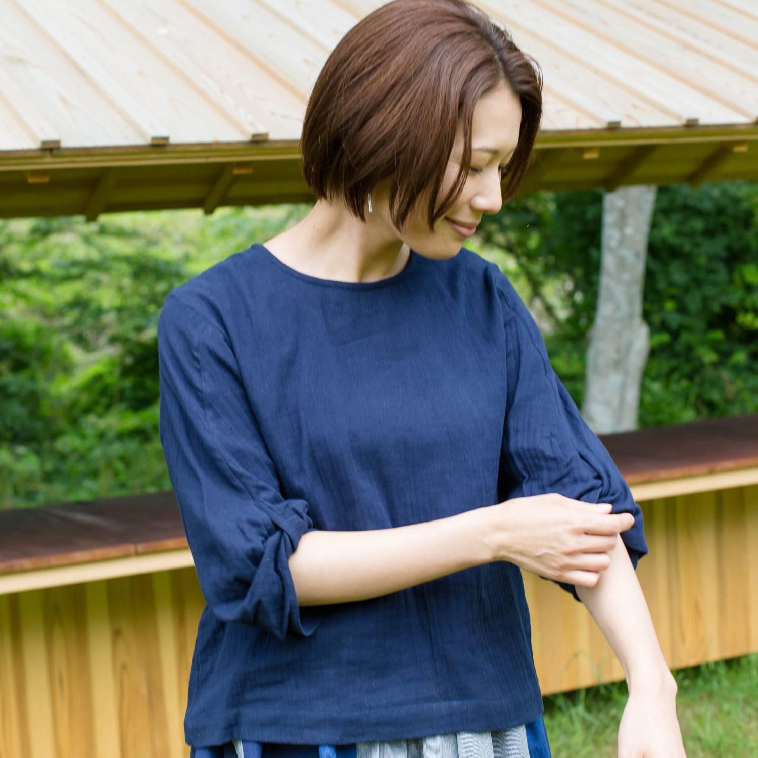 インドのターバンからヒントを得てデザインした、捻じった袖口がポイントのトップス。シンプルな首元、セットインにした肩は、他のアイテムとも合わせやすくなるようにこだわりました。