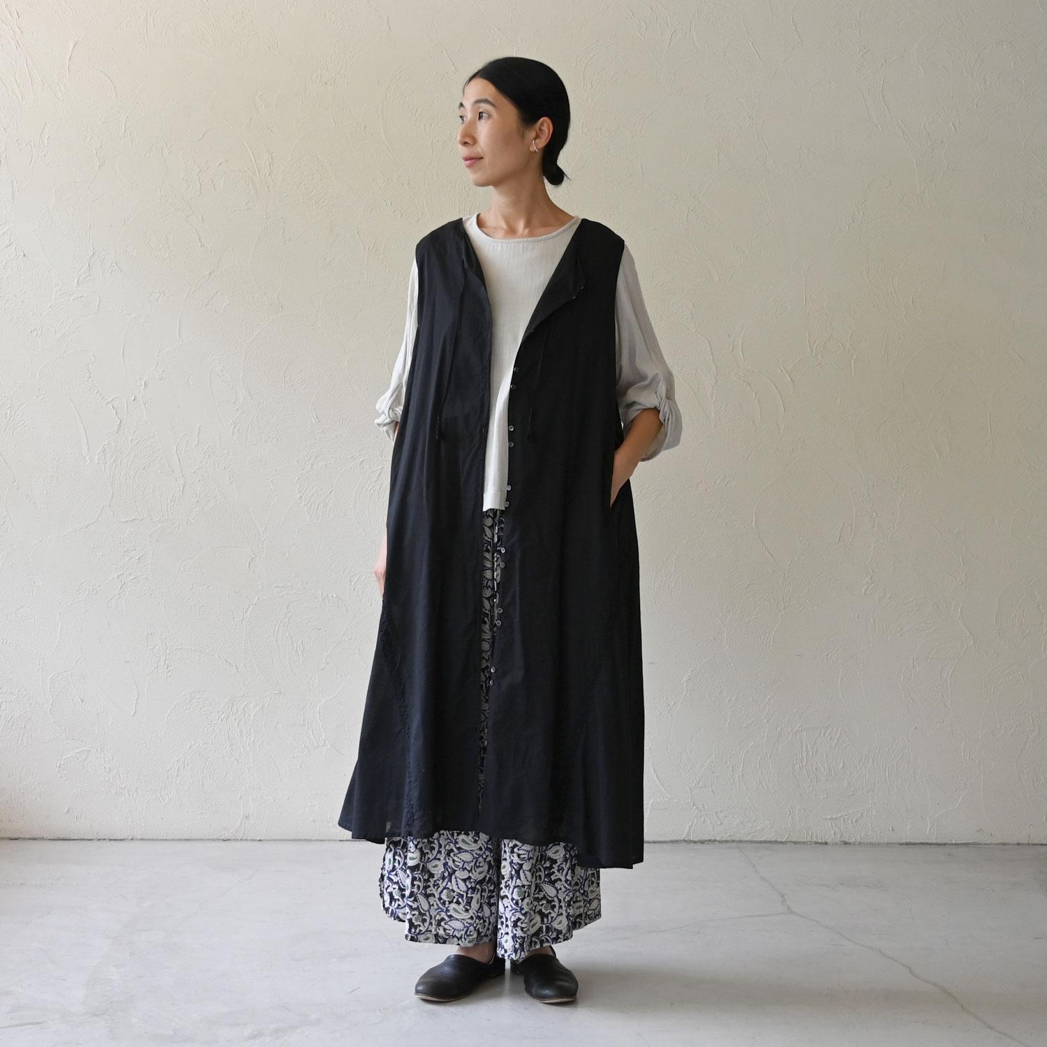 技ありのシンプルなトップスは柄物パンツとの相性抜群。ボリュームのある袖は腕をすらりと綺麗にも見せてくれます。ロングベストを合わせたら、モノトーンコーディネートの出来上がり!