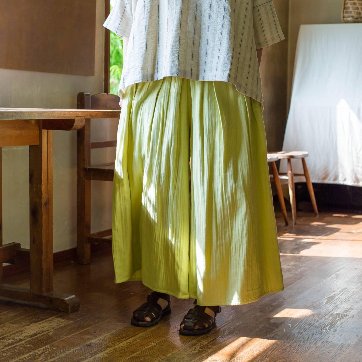 2016年にワイドキュロットとして登場して、早10年!裾にかけて広がったフレアが美しいワイドパンツです。普段着として、ちょっとしてお出かけにも活躍する一枚。卸ヨシダも愛用しています!