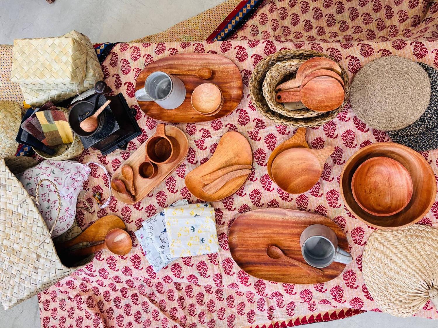 前回好評いただいたneem woodセットに、暮らしの布やブロックプリントの布小物、